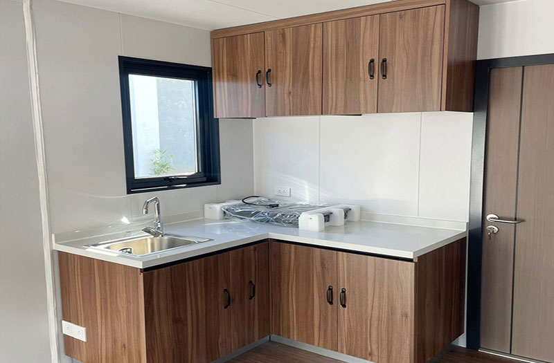 Optional extras include kitchen base and wall units, air conditioning, an electric water heater, a two-bedroom partition cupboard, a ceramic glass cooktop, an electric oven and a high-power extractor hood.